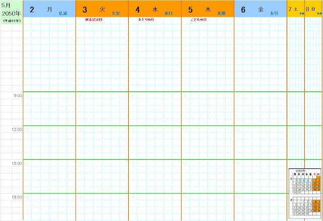 I made it with an excel spreadsheet. I just have to input the beginning date of the schedule sheet and all items are automatically displayed, that is, the day of the week, the holidays, an old Chinese divination called “rokuyou”, and a small two months calendar.